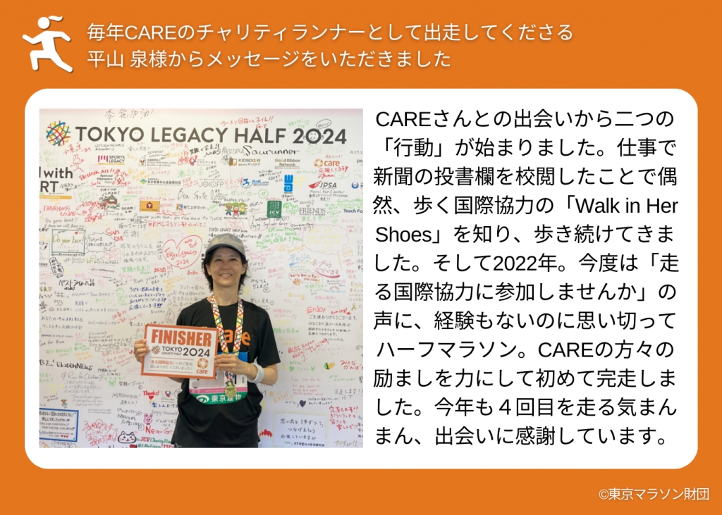 当イベントは、走ることを通じて社会貢献を実現する機会であり、誰もが「走る支援者」として参加できます。CAREはチャリティランナーおよび寄付者の皆さまとともに、未来につながる一歩を刻んでまいります。