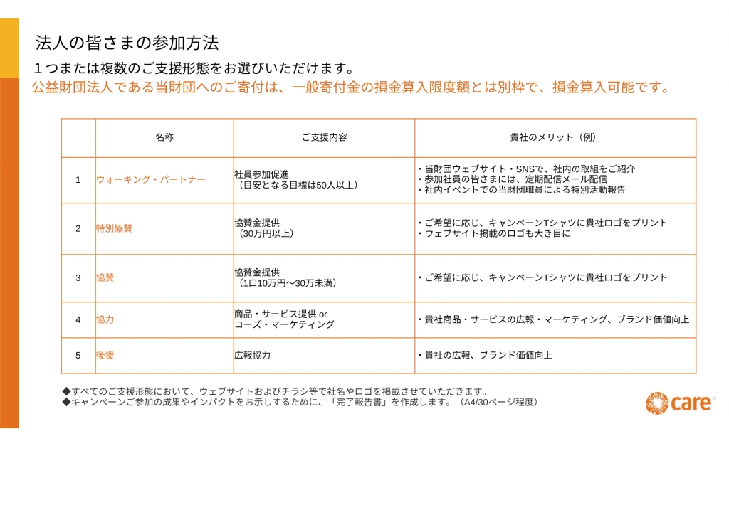 1つまたは複数のご参加形態をお選びいただけます。すべてのご参加形態において、ウェブサイトおよびチラシ等で社名(やロゴ等)を掲載させていただきます。